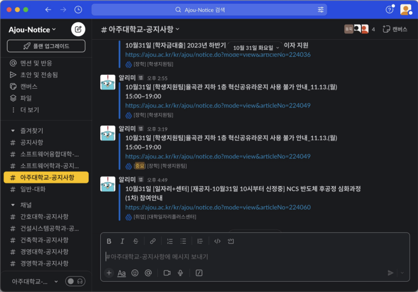 처음 장원이형이 만든 공지사항 크롤링 프로그램은 공지사항을 슬랙 채널로 올려서 알림을 띄우는 방식이었다.