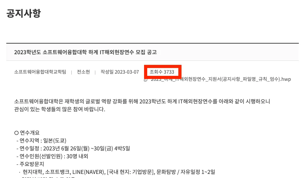 그래서 시간만 나면 소프트웨어융합대학 공지사항에 들어가 선발 공지사항이 올라왔는지 확인했다.