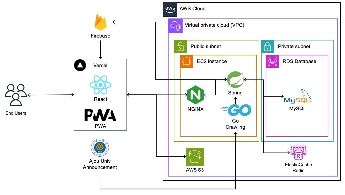 파란학기제를 같이하는 나와 은정이 둘 다 스프링을 주력으로 개발했기 때문에 스프링 + JPA를 선택했다. 개발한 뒤에 이유를 덧붙이자면, 위의 아키텍처에서 볼 수 있듯이 스프링이 크롤링 서버가 보낸 공지사항을 특정 API로 받는 역할도 하고, 일반 API 서버로서의 역할도 하고, FCM으로 푸시 요청도 해주는 여러 가지 역할을 수행한다.