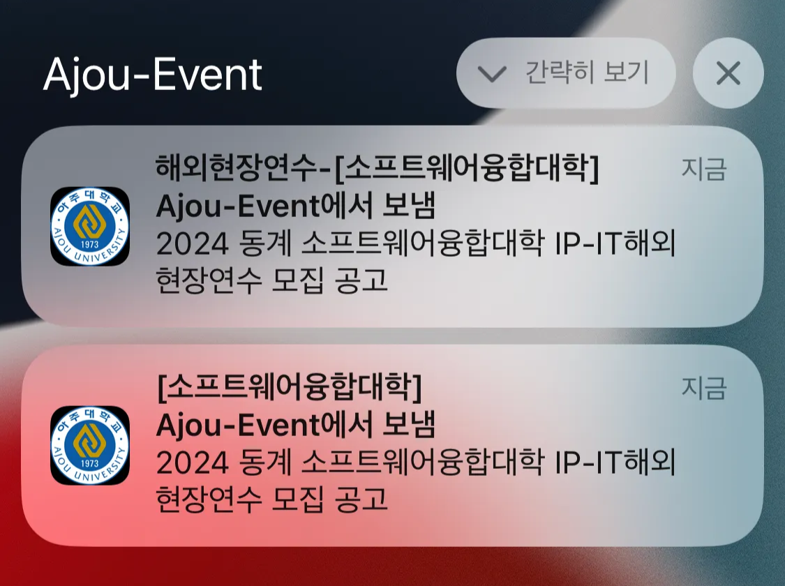 기능 개발 배경 - 푸시 알림이 너무 많이 와요… 아주대학교 '일반 공지사항'을 구독한 사용자들로부터 “하루 30~50건씩 올라오는 공지로 인해 푸시 알림이 너무 자주 와서 부담스럽다”는 피드백이 왔다.흥미로운 부분은, 사용자들이 그렇다고 해서 구독을 완전히 취소하고 싶어하지는 않는다는 것이었다.구독을 취소하면 '구독 탭'에서 새 글을 바로 확인할 수 없고, 필요할 때마다 '검색 탭'에서 직접 찾아야 하는 불편함이 생기기 때문이다.실제로 구독 탭의 네비게이션 바에 표시되는 '배지'를 통해 사용자가 구독한 새로운 공지사항이 올라왔다는 소식을 알려주고 있었다. 사용자 입장에서는 특정 공지사항에 대해 “구독은 유지하고, 알림만 끄고 싶어요”라는 니즈가 존재했다. 기존 구조는 Topic(공지사항) 구독 = 푸시..