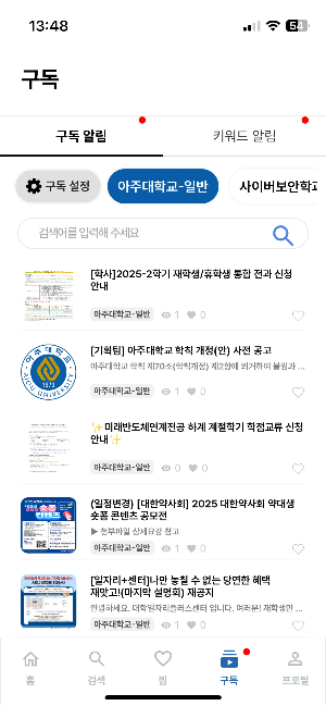 기능 개발 배경 - 푸시 알림이 너무 많이 와요… 아주대학교 '일반 공지사항'을 구독한 사용자들로부터 “하루 30~50건씩 올라오는 공지로 인해 푸시 알림이 너무 자주 와서 부담스럽다”는 피드백이 왔다.흥미로운 부분은, 사용자들이 그렇다고 해서 구독을 완전히 취소하고 싶어하지는 않는다는 것이었다.구독을 취소하면 '구독 탭'에서 새 글을 바로 확인할 수 없고, 필요할 때마다 '검색 탭'에서 직접 찾아야 하는 불편함이 생기기 때문이다.실제로 구독 탭의 네비게이션 바에 표시되는 '배지'를 통해 사용자가 구독한 새로운 공지사항이 올라왔다는 소식을 알려주고 있었다. 사용자 입장에서는 특정 공지사항에 대해 “구독은 유지하고, 알림만 끄고 싶어요”라는 니즈가 존재했다. 기존 구조는 Topic(공지사항) 구독 = 푸시..